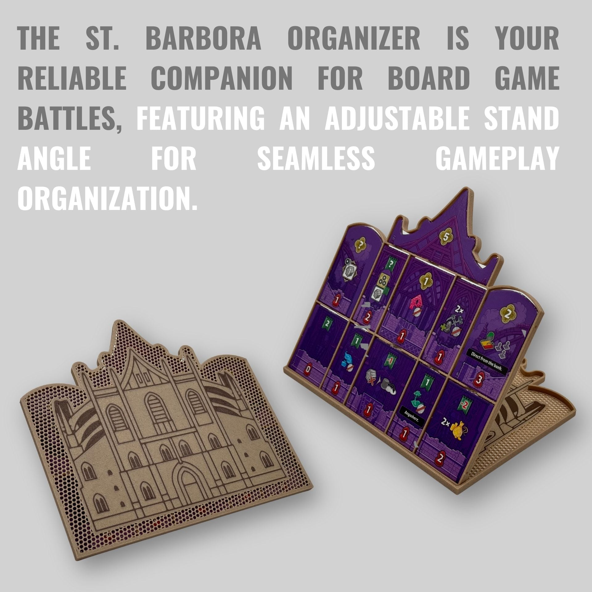 - The St. Barbara's Cathedral tile organizer can be set to several preset angles, so each player can see the assortment of these tiles clearly.