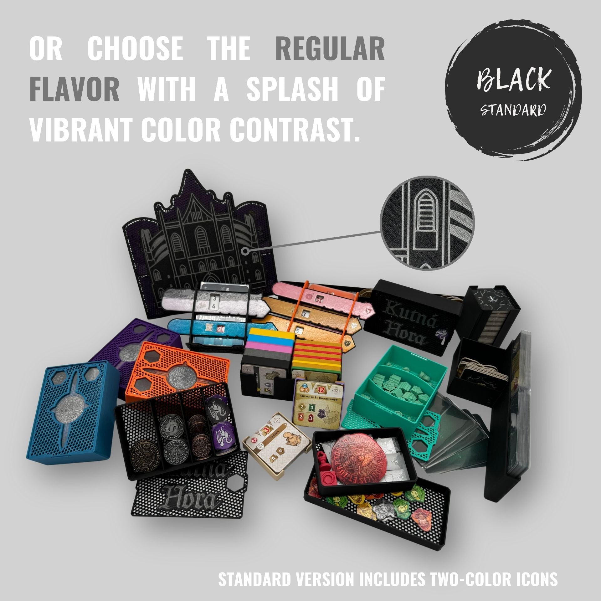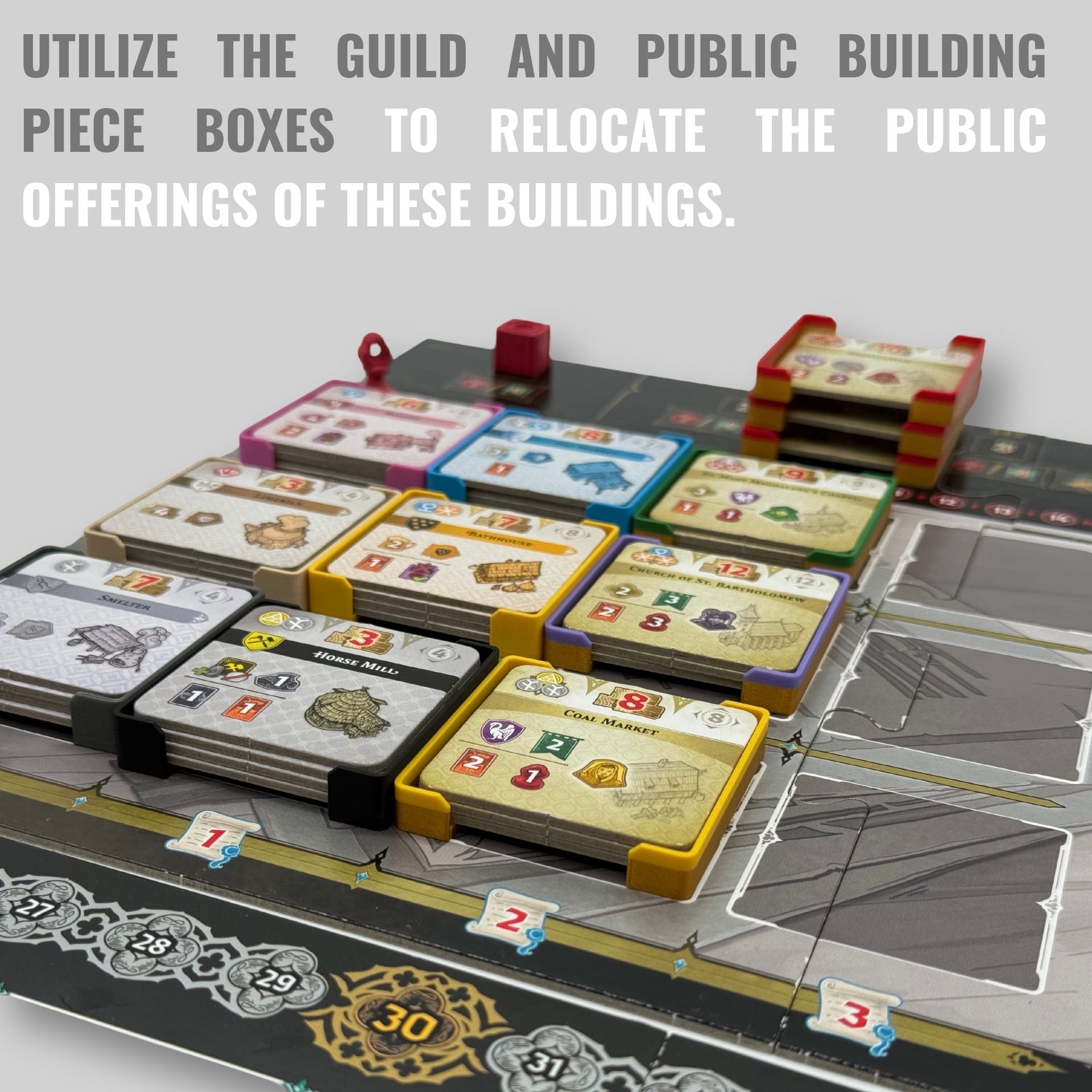 - The guild and public building piece boxes can be easily used during gameplay - making them easy to manage.
