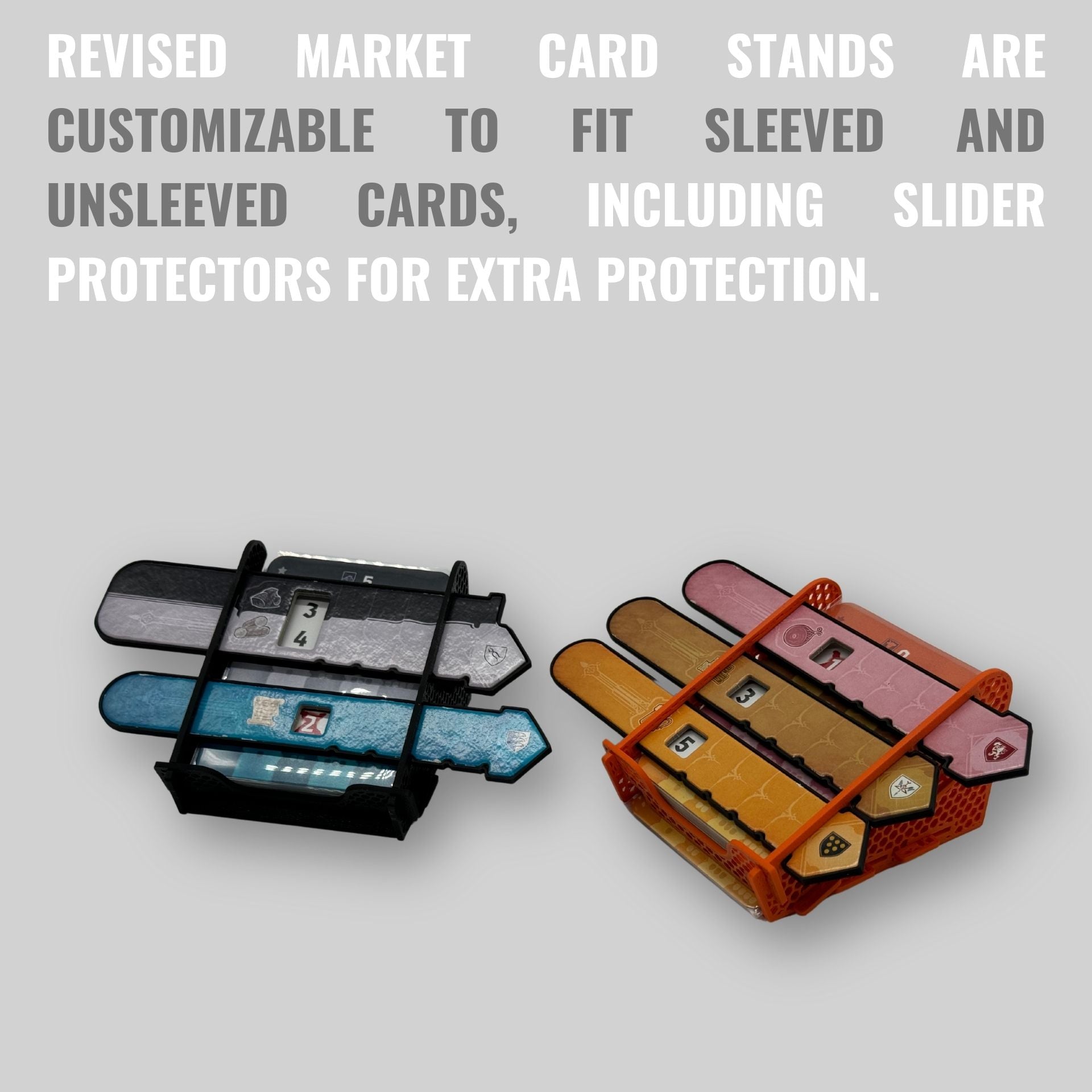 - The insert also includes modular market card stands.You can set them up for both sleeved and unsleeved cards. The stands include protection for the sliders so they will no longer get damaged.
