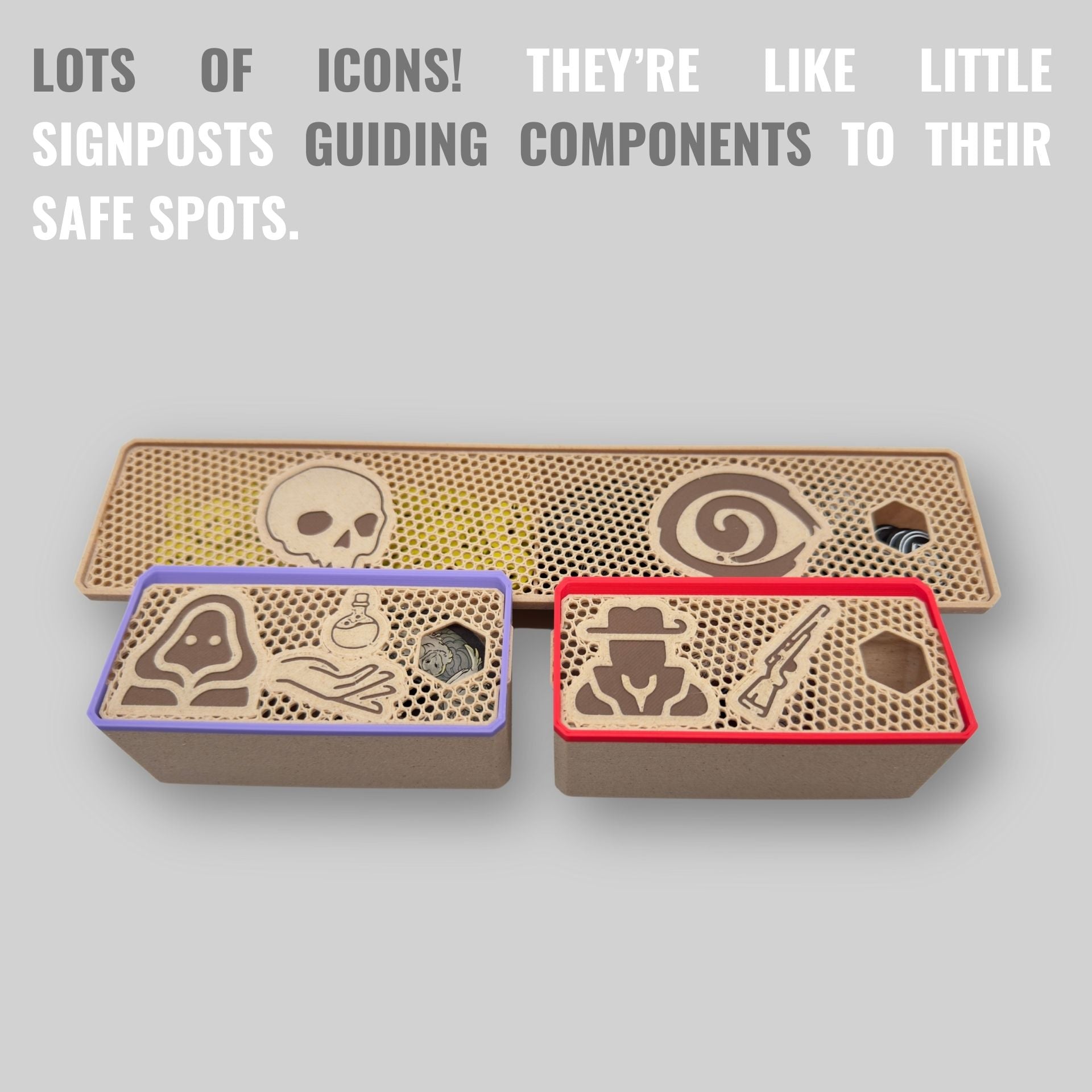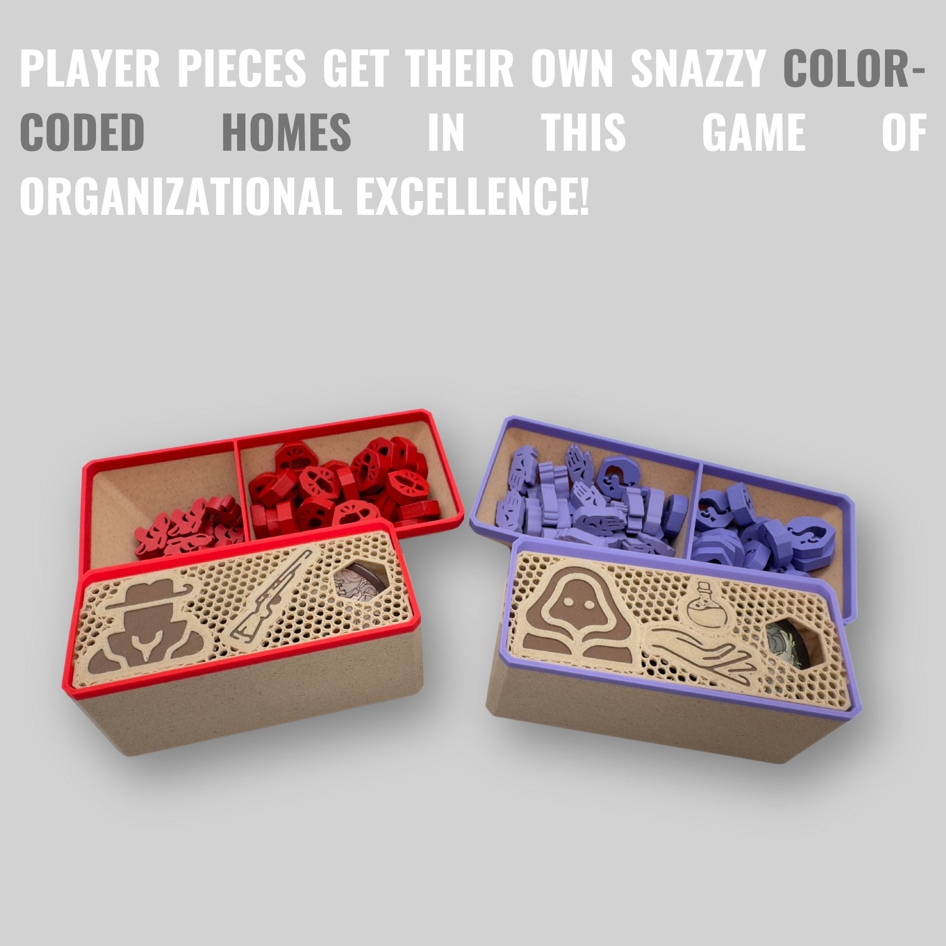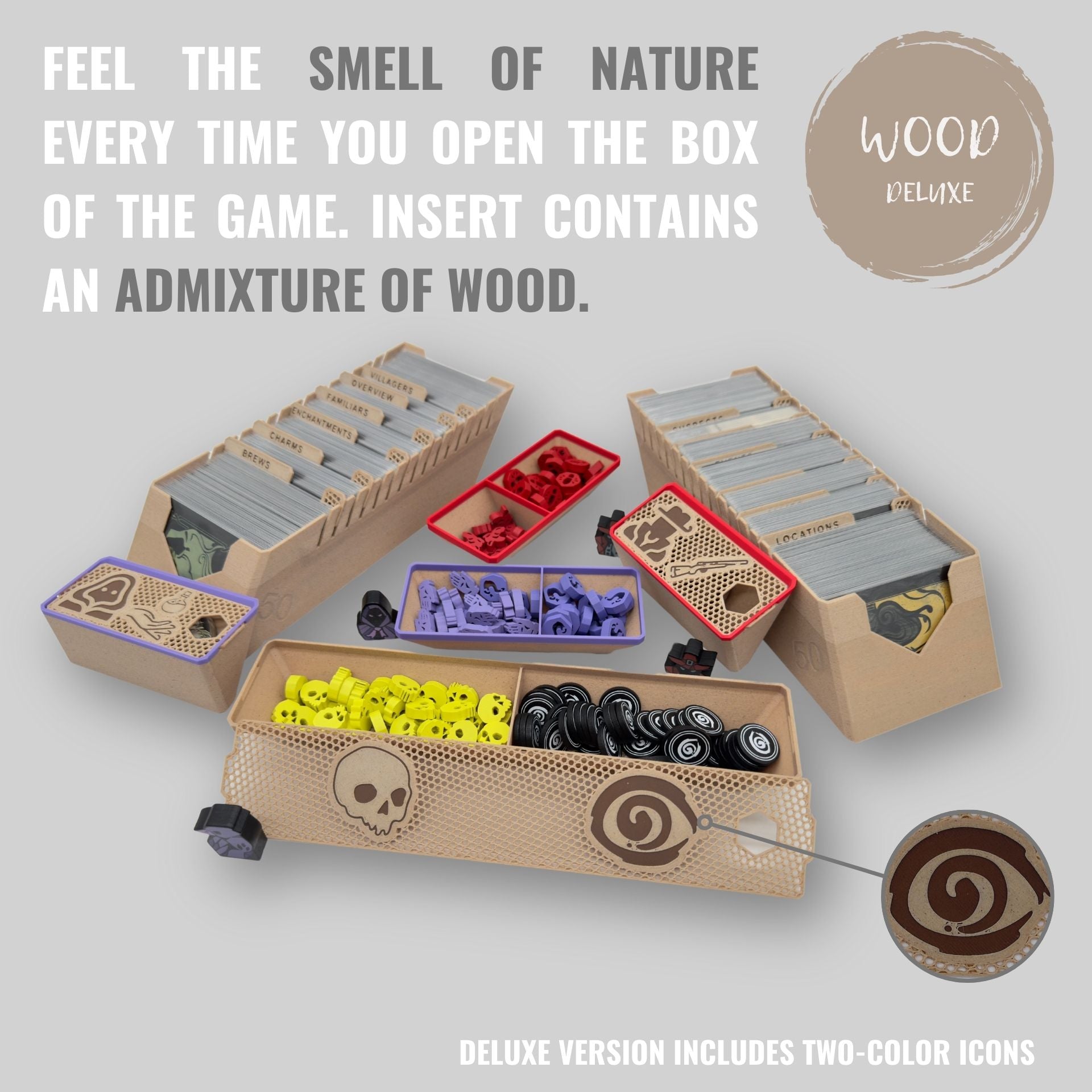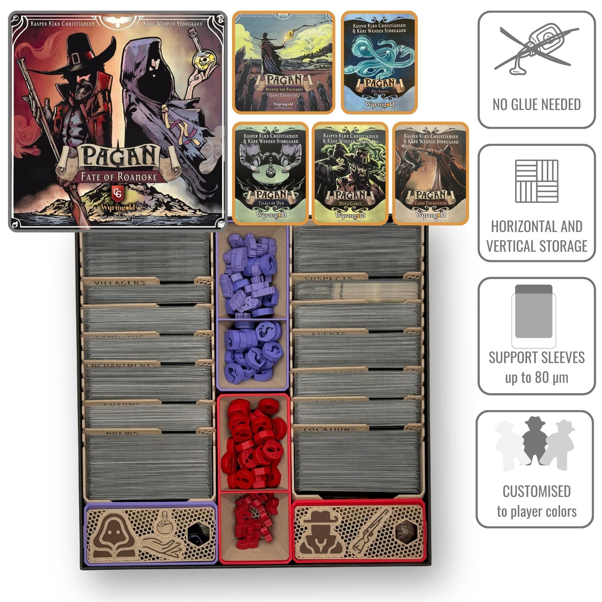 3D printed insert for the board game Pagan: Fate of Roanoke (2022) including expansions Beyond the Palisades, Cards of the Ancestors, Close Encounters, Mind Games, Trials of Old and Deluxe components.