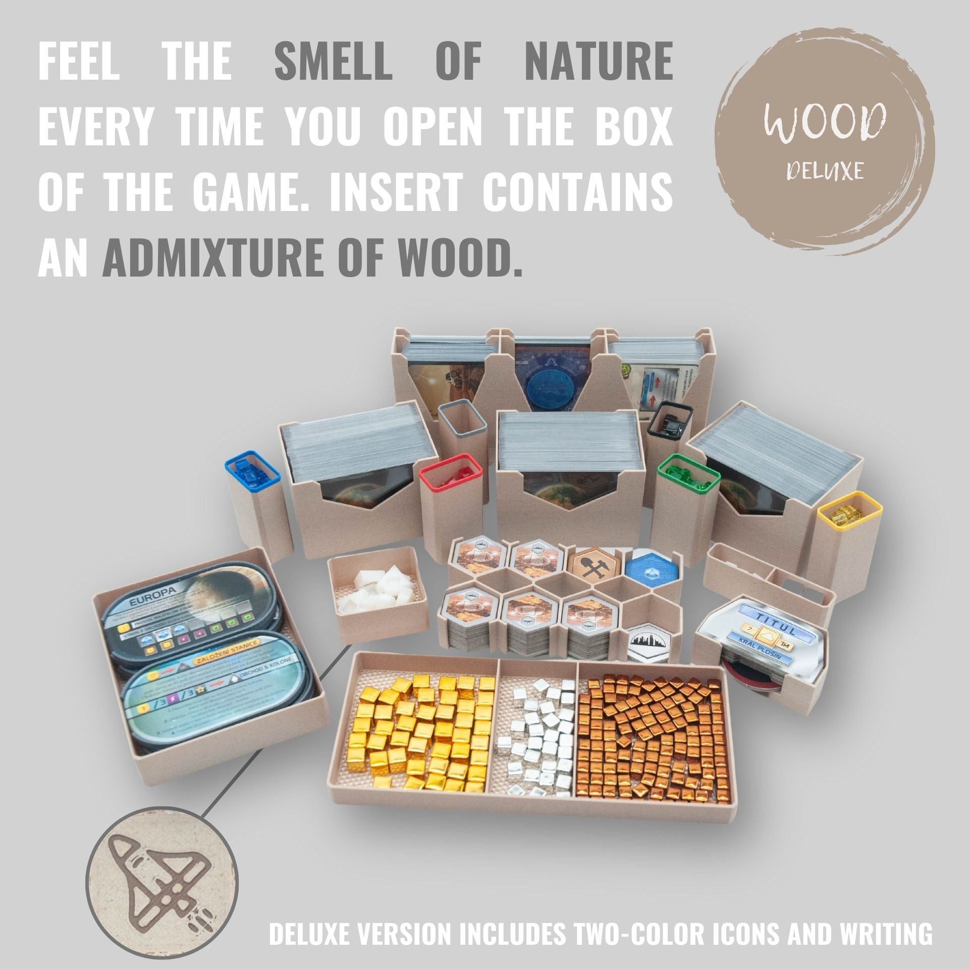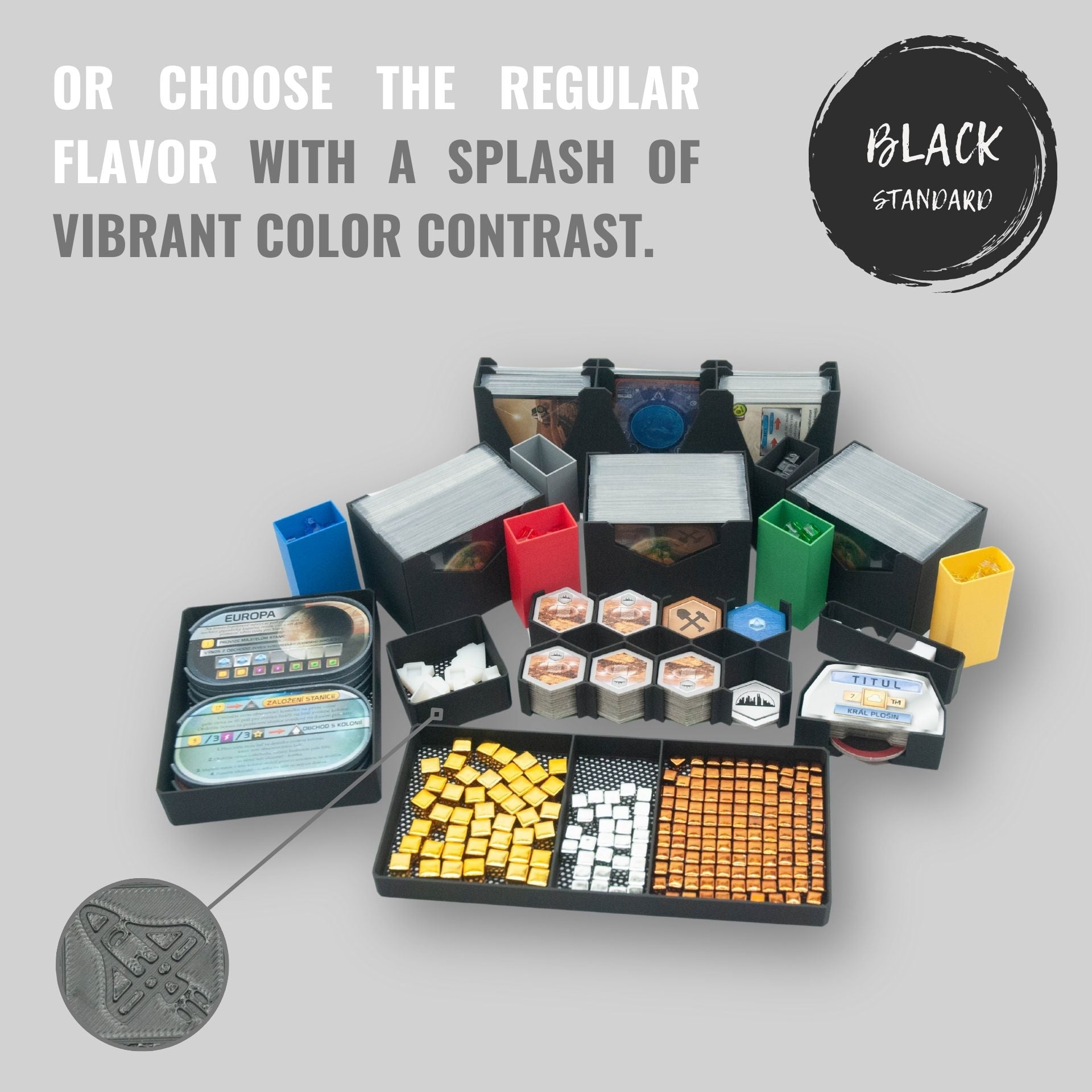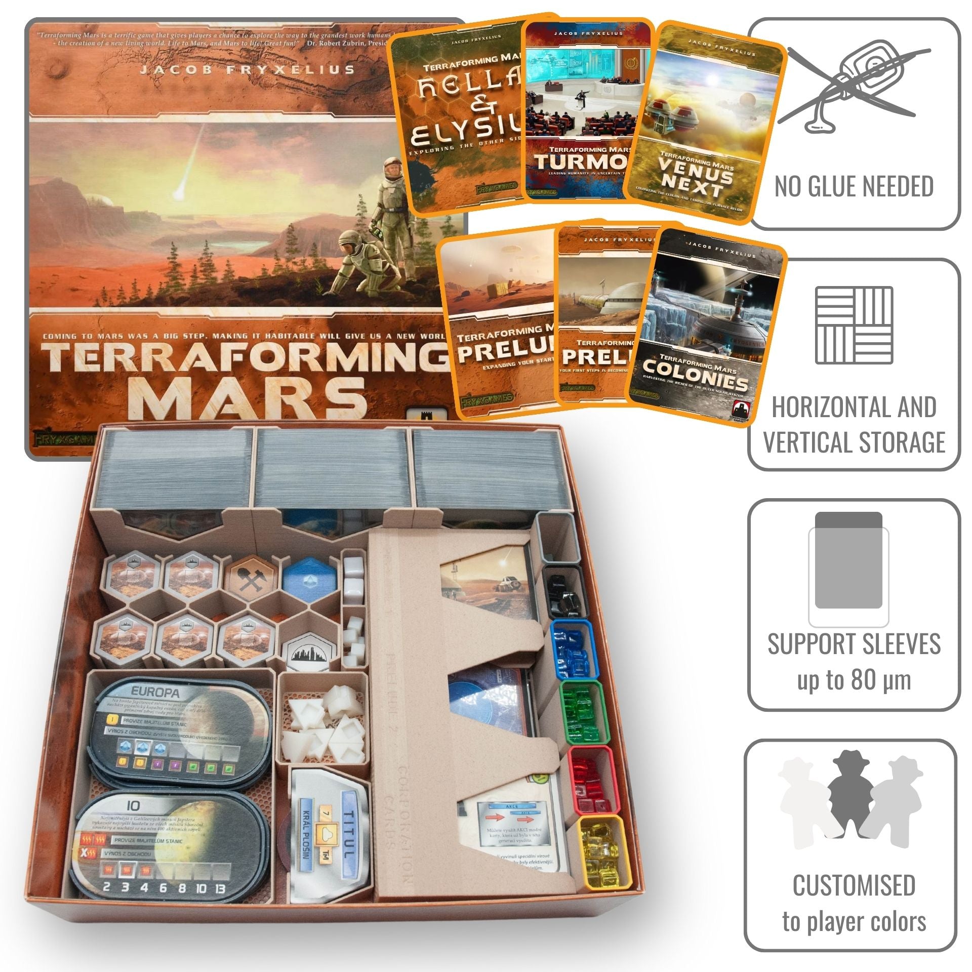 3D printed insert for board game Terraforming Mars (2016) including expansions Turmoil, Colonies, Prelude, Hellas & Elysium, Venus next, Prelude 2 and double layer player's boards